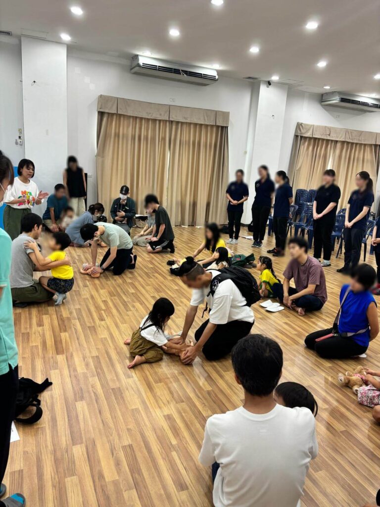 当日は、誤嚥による窒息時の対応や心肺蘇生、タイにおける救急車の呼び方など、緊急時に役立つ対応方法について、実演を交えながら解説いたしました。実際の場面をイメージしやすい形でお伝えすることで、参加者の皆様に具体的な対応の流れをご確認いただきました。